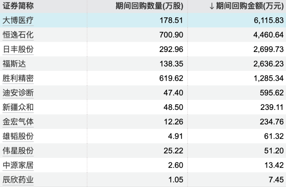 12家上市公司股票获回购聚赢盘,大博医疗回购金额最高12家上市公司股票获回购,大博医疗回购金额最高