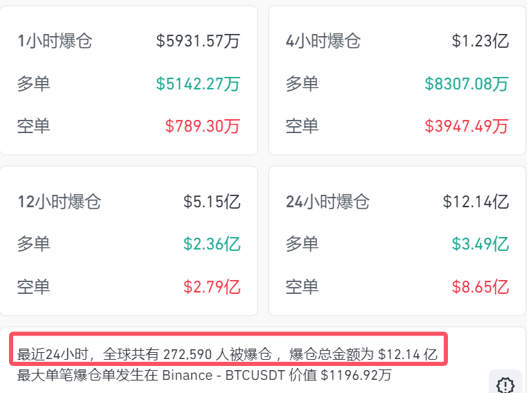 价格的急速上涨,导致不少空单爆仓。coinglass数据显示,24个小时内,加密货币全网合约爆仓12.14亿美元,爆仓人数超过27万人。其中空单爆仓8.65亿美元。最大单笔爆仓单发生在Binance-BTCUSDT,价值1196.92万美元。