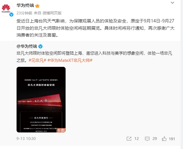华为终端:受台风天气影响仁信优配,非凡大师限时体验空间将延期展览华为终端:受台风天气影响,非凡大师限时体验空间将延期展览