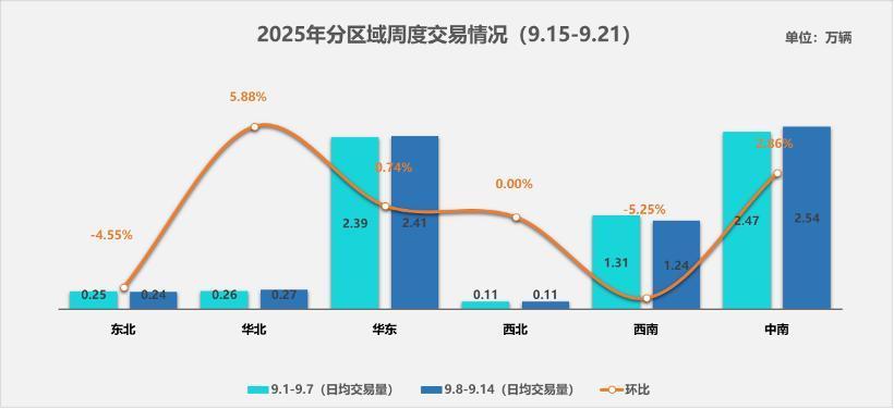 本周,二手车市场整体展现出温和上扬的态势。具体到各区域市场的表现,华北、华东及中南地区的交易量均呈现增长态势;西北地区市场则维持相对稳定,交易量未出现显著波动;而东北和西南地区本周的交易量则略有下降。